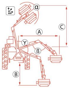 | Modelo | Ancho de trabajo (mm) | Peso (Kg) | Cuchillas | Ø Rotor | Potencia requerida | PTO (RPM) | A | B | C | α | β |
